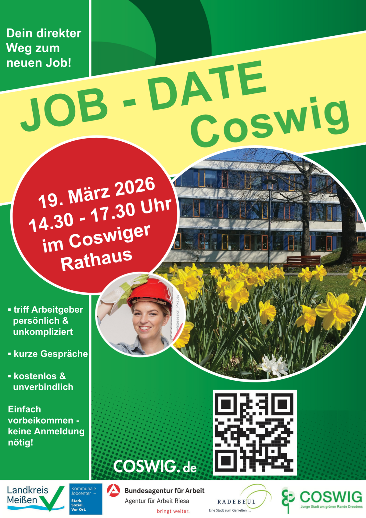 Das erste Job-Date findet am 19. März 2026 von 14:30 bis 17:30 Uhr im Rathaus Coswig statt. Ein weiterer Termin ist für den 17. September 2026 in Radebeul geplant. Künftig soll die Veranstaltung im Wechsel in beiden Städten ausgerichtet werden.
